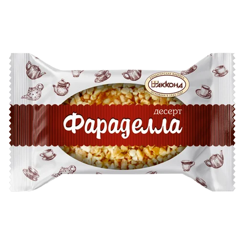 Десерт с глазированным донышком, сочетающий в себе вафельный корпус со сливочной кремовой начинкой в карамели с обсыпкой крупкой арахиса.