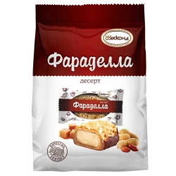 Десерт с глазированным донышком, сочетающий в себе вафельный корпус со сливочной кремовой начинкой в карамели с обсыпкой крупкой арахиса.