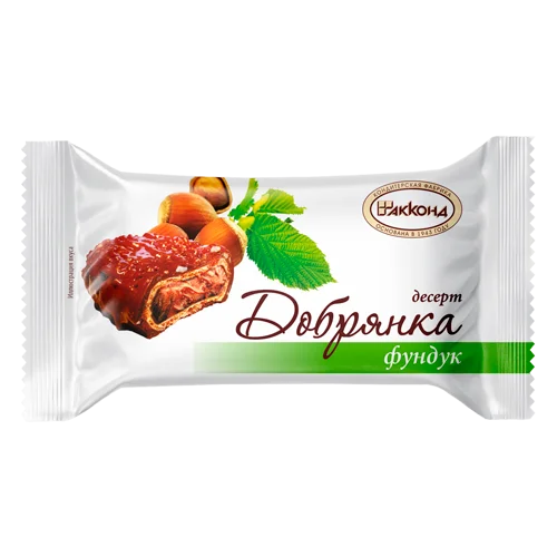 Десерт глазированный в вафельном корпусе в обсыпке крупкой арахиса с кремовой начинкой на основе фундука.
